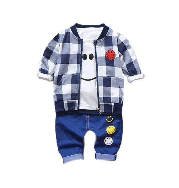 - 3-piece cool clothing set for kids, with 1 long sleeve t-shirt, 1 Trousers with mock fly, elasticated waistband, two front pockets & 1 Sweatshirt Jacket with ribbed collar, 2 pockets and front zipper opening